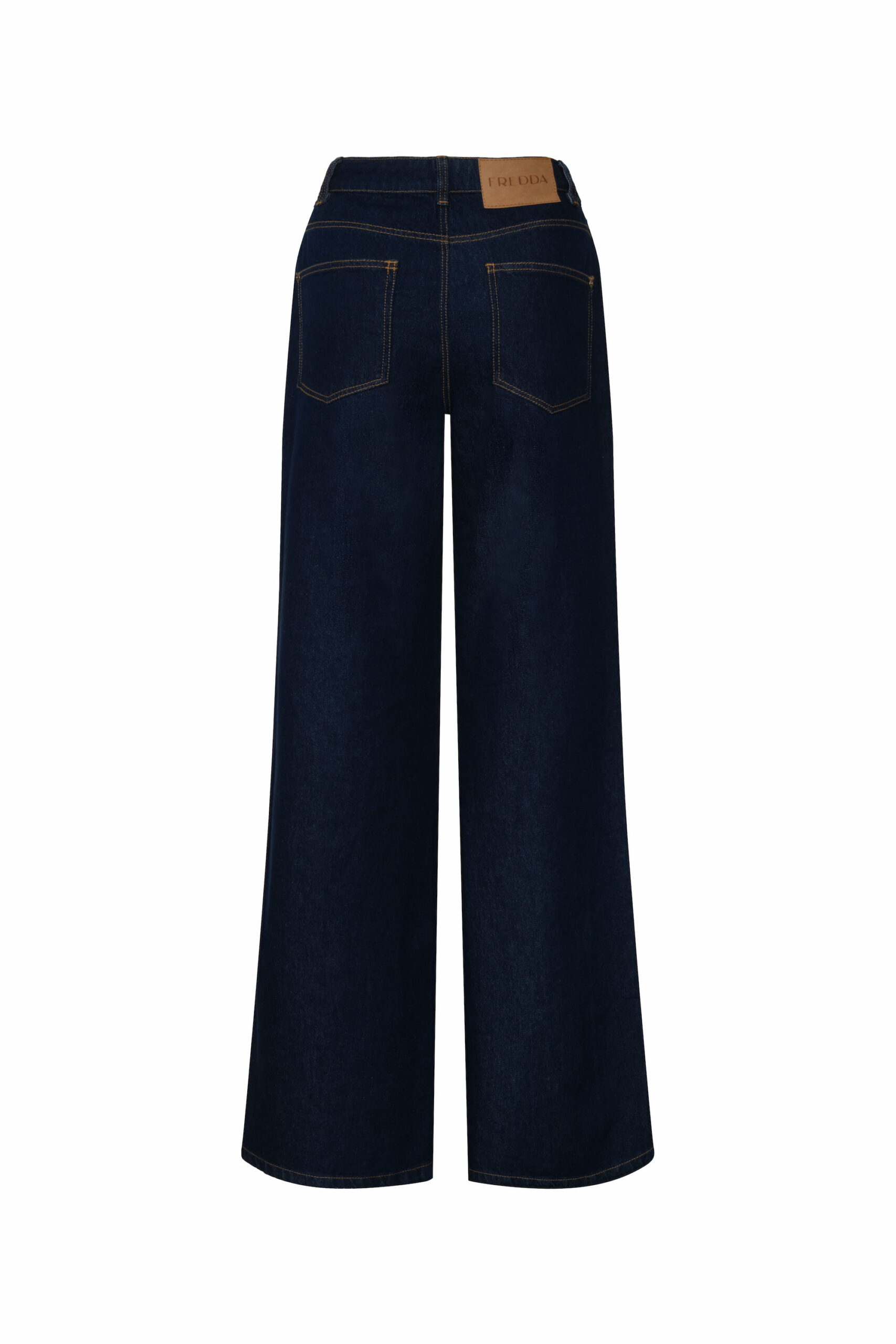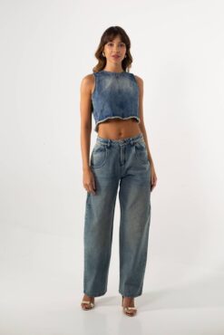 Jean wide leg tiro alto, confeccionado en denim 100% algodón de tono azul oscuro.